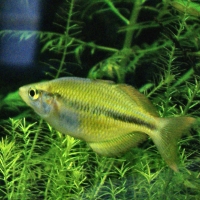 Lake Tebera Rainbowfish Alternative Name(s): Yellow Rainbowfish Scientific Name(s): Melanotaenia herbertaxelrodi Category: Tropical Difficulty: Maximum Size: 10cms Minimum Tank Volume: 100 litres Minimum Tank Size: 36" Water Temperature Range: 20-26°C Water pH Range: 7.0-8.0 Water Hardness Range: 10-15 dGH
